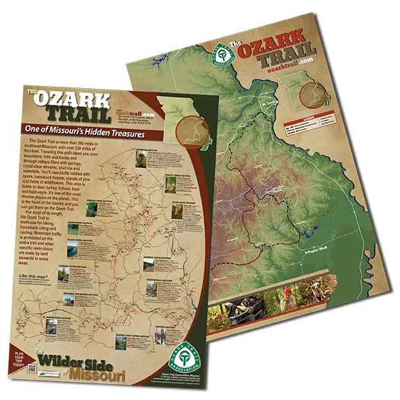 This 24″ x 36″ poster is great for daydreaming about your next adventure on the Ozark Trail. The front side displays a line map and details about 13 sections of the OT and you can flip it over for a satellite image of Missouri featuring the Ozark Trail.