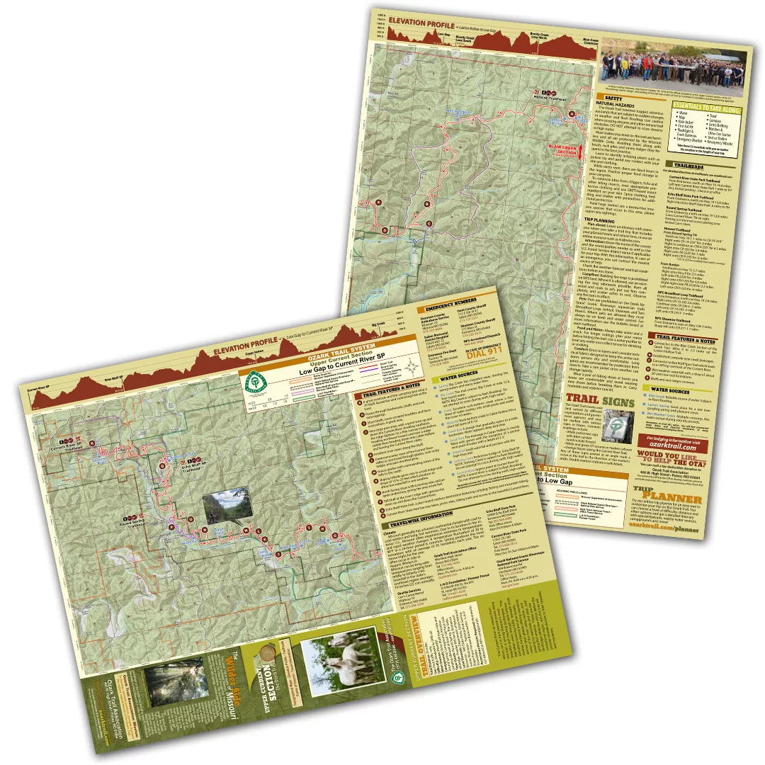 A good trail and a good map go hand-in-hand, and we’ve mapped out each section of the Ozark Trail for you! Our topographical section maps include elevation profiles, trailheads, points of interest, traveler information and more. These high-quality maps are printed on waterproof and tear-resistant paper.